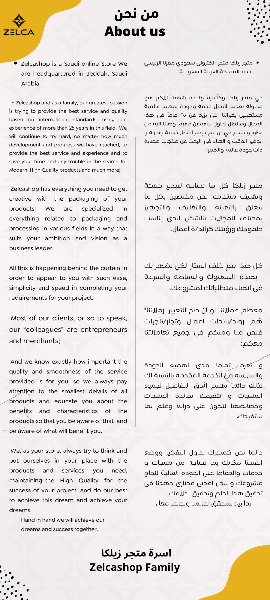 في متجر زيلكا وكأسرة واحدة شغفنا الاكبر هو محاولة تقديم افضل خدمة وجودة بمعايير عالمية مستعينين بخبراتنا التي تزيد عن 25 عاماً في هذا المجال وسنظل نحاول جاهدين مهما وصلنا اليه من تطور و تقدم في ان يتم توفير افضل خدمة وتجربة و توفير الوقت و العناء في البحث عن منتجات عصرية ذات جودة عالية والكثير ؛
